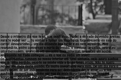 Esta semana foi uma semana dura, porque como sempre gostaria que passasse rapido para chegar o fim de semana, mas depois em contradição tenho o facto de te ires embora este fim de semana e vais deixar-me por algum tempo ... Eu sei que tens de ir e por isso ainda não te disse nada sobre a tua partida, sei que também não e facil para ti e não te quero prejudicar, não penses que sou egoista e que não vou sentir a tua falta porque sei que vou sentir muito mesmo a tua falta, ja a estou a sentir e ainda não partiste ... adorava poder ir contigo mas não posso infelizmente talvez na proxima viagem a possa fazer contigo .... dar um passeio pela europa parece-me bem ... Estes ultimos tempos teem me feito acreditar no que realmente a vida significa. Acho que o amor tem destas coisas muda-nos por dentro e por fora. Agora vejo as coisas de uma forma, sinto-me numa viagem da qual não quero sair nem muito menos regressar. Devo a minha felicidade a uma pessoa muito especial e a ela tudo lhe agradeço ...